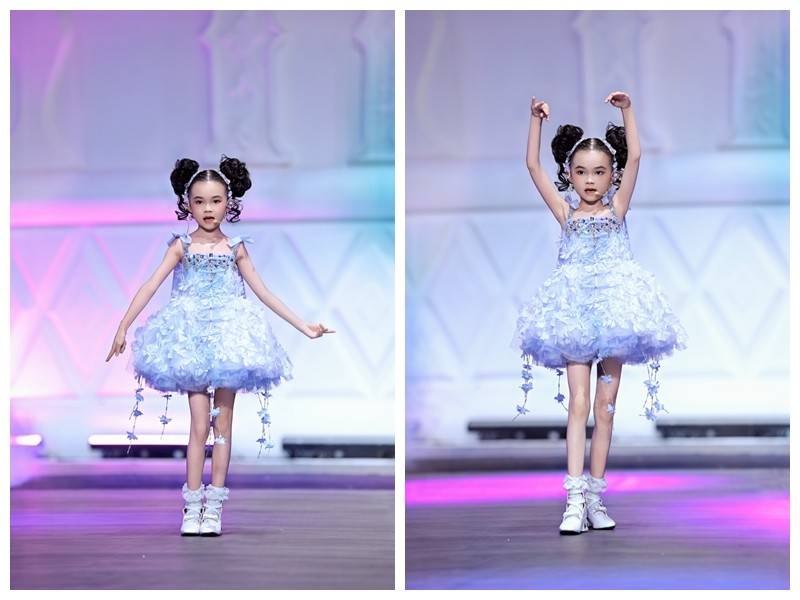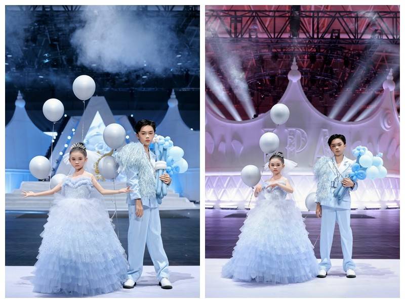 亲子秀环节,她与陪伴官直接将 “梦幻感” 拉满!冰雪城堡般的舞台烟雾轻绕,女孩身着层叠如云朵的淡蓝蓬纱裙,头纱与裙身碎钻随步伐闪闪发亮;男孩一身缀着轻羽装饰的浅蓝套装,手持渐变蓝白的气球花束,优雅中透着少年灵动感。两人同框走秀时,步伐节奏稳稳契合,女孩偶尔俏皮叉腰、男孩自然递出气球花的互动,把童真与精致感平衡得恰到好处,每一步都像在为 “童话时刻” 盖章,让整个秀场都浸满温柔又治愈的氛围。
